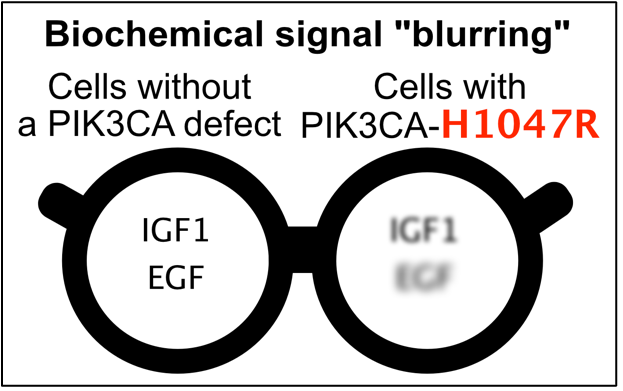 From day one of starting my own research group, I have sought to embed the very same values in all we do. I have been incredibly lucky to recruit a fantastic student, Oliwia Mruk, who joined my laboratory as a summer student, then an honours student and, moving forward, a PhD student. Oliwia is dedicated to and passionate about PIK3CA-focused research of relevance to CLOVES and PROS more generally; stay tuned, you will hear more of her in the future. Together, we completed work that I had started at UCL Cancer Institute prior to moving to Dundee; this work is now publicly available but may be too technical for a quick read. In a nutshell, we have discovered that the PIK3CA-H1047R defect commonly found in CLOVES/PROS can lead to “blurred” signal perception. In other words, cells are no longer able to distinguish different types of signals such as specific hormones or factors that control growth. An analogy that I have been using a lot to convey the key message is one of blurred vision, as shown below.